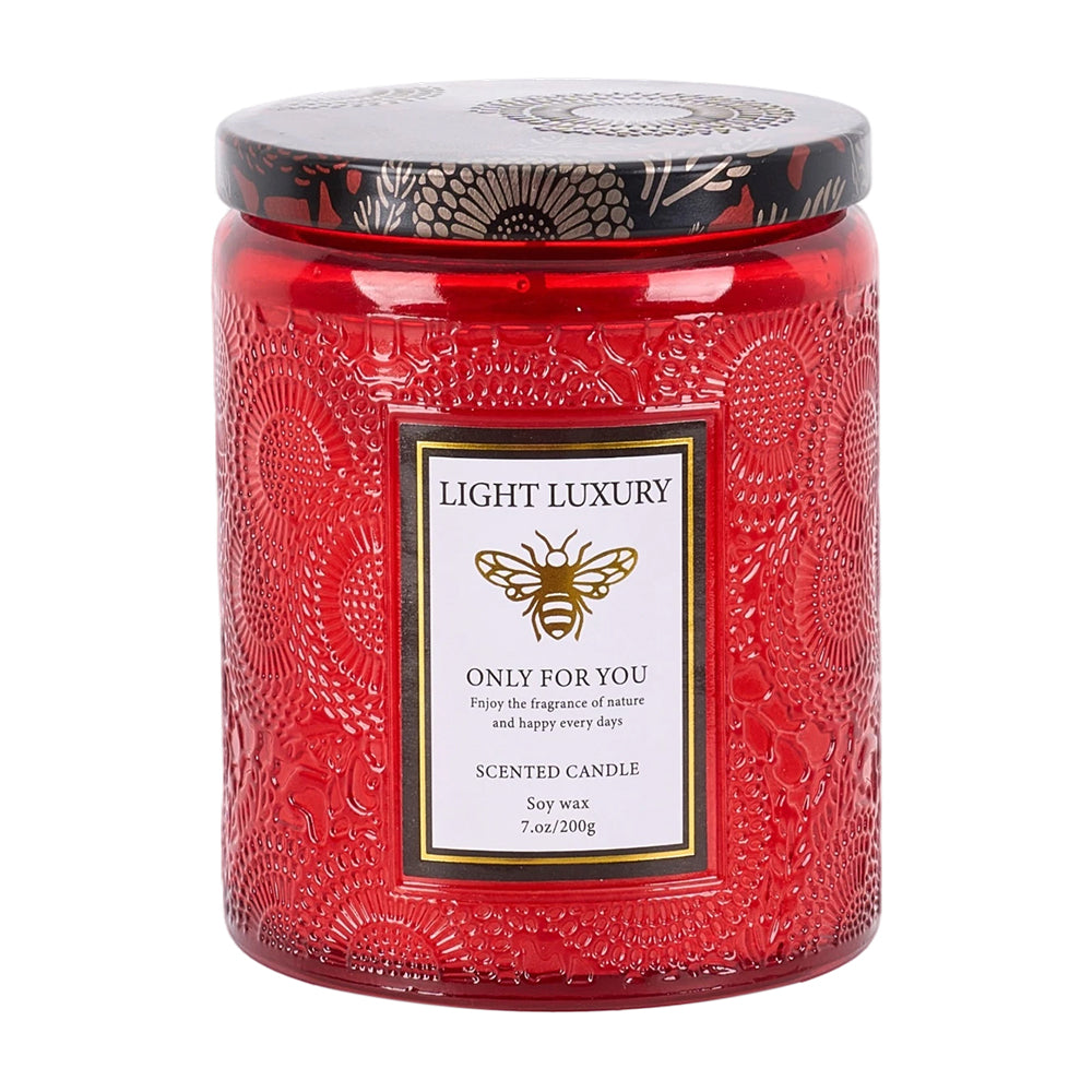 Brighten your home with a touch of serene elegance using this artfully crafted scented candle. The glass container is adorned with intricate embossed patterns, creating a romantic and elegant presence. With a soy wax base, it burns cleanly to release a rich, long-lasting scent designed to help soothe the mind and unwind after a busy day. A matching decorative lid helps preserve the scent between uses and keeps dust away, making it both a beautiful decor piece and a practical aromatic companion.