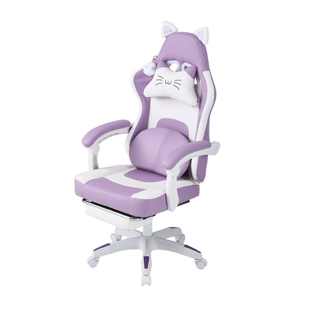 This purple-and-white gaming chair blends cute cat-inspired style with comfort and function. The high backrest and generously sized seat offer excellent support and a snug fit. It features 360° swivel, height adjustment, a backrest adjustable function, and a retractable footrest—perfect for switching seamlessly between gaming, working, and relaxing. Synchronised armrests, a dual-point massage lumbar pillow, and a soft headrest help relieve fatigue during long sitting sessions. Moreover, filled with premium high-resilience sponge, it stays soft yet supportive over time.