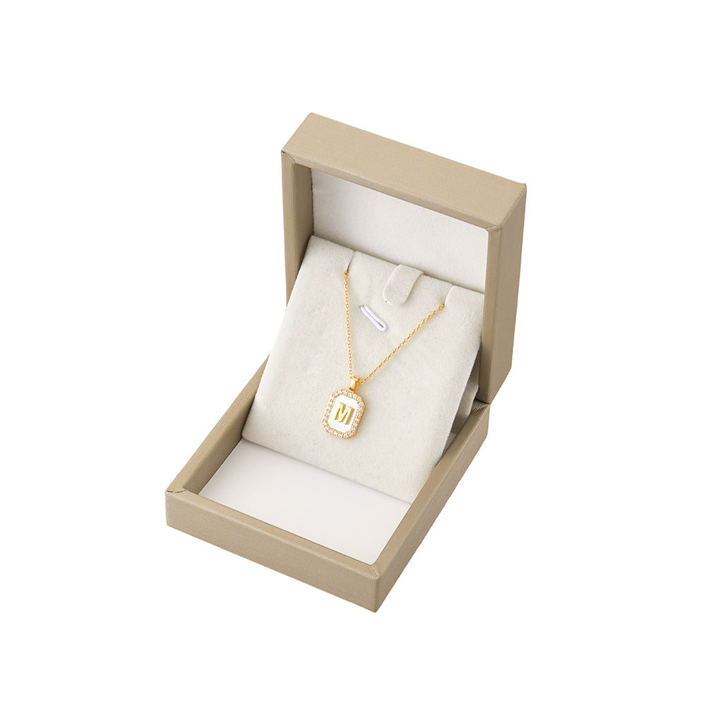 This diamond-studded design necklace perfectly combines luxury and elegance. Employing an 18K gold electroplating process, it showcases a charming golden lustre that enhances the overall sense of luxury. The pendant is encrusted with a circle of sparkling cubic zircons around its edge, highlighting a unique charm of romance and grace. The central letter is artfully placed on a smooth and delicate mother-of-pearl surface, complementing the sparkle of the cubic zircons and adding to the refined feel of the piece. With its fluid design lines and a sense of three-dimensionality, it fully embodies the unique taste and allure of the wearer.