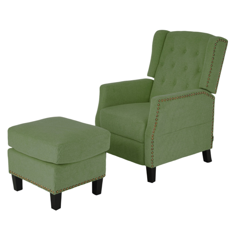Indulge in refined comfort with a pushback reclining chair and matching footstool designed for relaxation and elegance. Exquisite nailhead trims define its silhouette and showcase craftsmanship and attention to detail. The subtly winged backrest and button-tufted detailing create a sophisticated profile, making it a striking centrepiece in any living space. Generously padded cushions deliver lasting comfort and optimal support, ensuring hours of ease. A gentle push activates the reclining mechanism, extending the footrest to provide relaxed leg support. The coordinated footstool offers a versatile complement, ideal for unwinding after a busy day, reading, or simply enjoying a moment of calm.