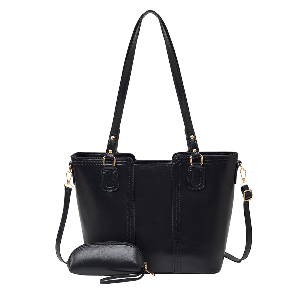 Enjoy the perfect blend of convenience and chic aesthetics that complements your outfits effortlessly with this tote bag. Crafted from premium PU leather, this bag not only showcases a subtle texture but also looks sophisticated. Its spacious interior easily accommodates all your essentials, making it perfect for busy days. Classic colour complements any outfit, effortlessly transitioning from work to weekends. Paired with a matching zippered purse, the set delivers not just a coordinated aesthetic but a functional duo for all your daily needs. Whether heading to the office, running errands, or travelling, this bag proves itself as a must-have accessory.