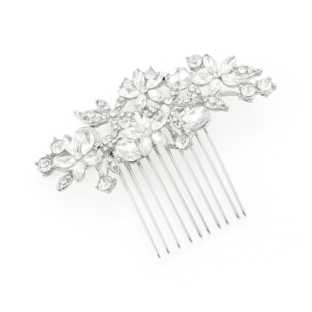 This hair comb is the perfect finishing touch for any hairstyle. Featuring an elegant floral theme, it boasts a vivid, layered design that exudes romantic and gentle charm. The main flowers are adorned with numerous clear-cut cubic zirconias in teardrop and round shapes, creating a dazzling display of light. Delicate leaf-like structures interspersed among the blooms, highlighted by minute cubic zirconias, enhance a three-dimensional and natural liveliness. A silver-plated metal base offers a bright sheen and premium feel, adding to its luxurious and sophisticated style. It is ideal for weddings, bridal photoshoots, or formal events—effortlessly enhancing your grace.