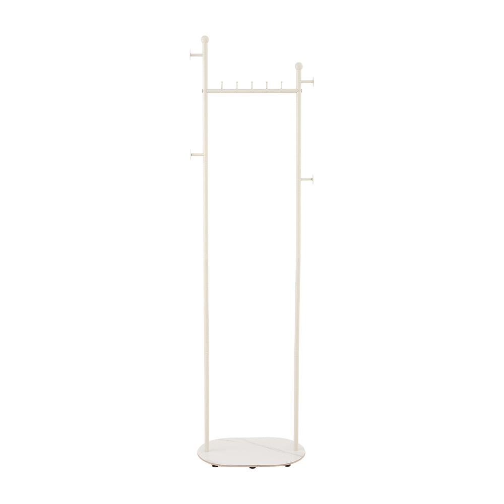 This freestanding clothes rack is an ideal choice for keeping your home tidy and organised. Its sleek lines effortlessly complement a variety of home decor styles, from Nordic to modern minimalism. The hanging rod is positioned at a convenient height for shirts, dresses, and long coats, while four additional side hooks offer flexible storage for scarves, hats, and bags. The oval marble-patterned base enhances overall stability and can also hold shoes or storage boxes. Whether you are rushing out in the morning or tidying up upon returning home, this clothes rack provides an orderly and easily accessible storage solution.