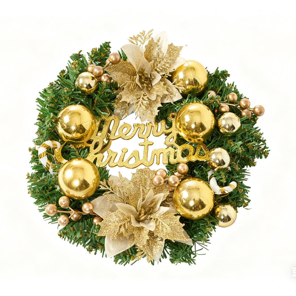 This Christmas wreath beautifully combines classic holiday elements to radiate warmth and festive cheer. Featuring green pine needles as the base, it is adorned with shimmering gold ornaments, faux golden flowers, and golden berry clusters, creating rich layers of luxurious, joyful elegance. At its centre sits an elegant “Merry Christmas” plaque in gleaming gold, enhancing both theme and visibility. Perfect for hanging on your front door, window, or wall, this wreath instantly becomes the focal point of your seasonal décor, bringing a vibrant and heartfelt Christmas spirit to your home.