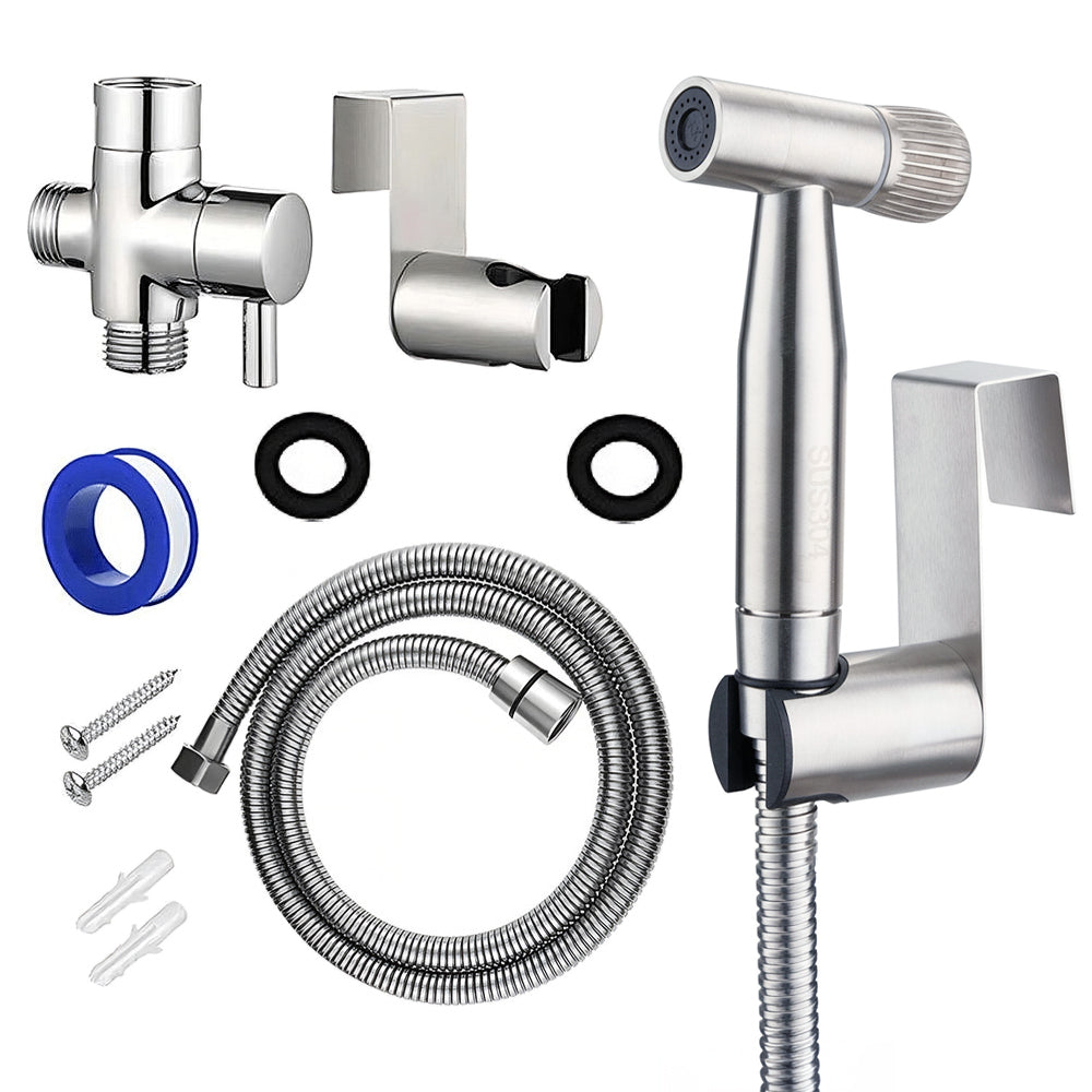 Maintain cleanliness with this high-quality bidet sprayer kit. Made from corrosion-resistant 301 stainless steel, it is durable and stays bright for years. An integrated pressure-boost system delivers a steady, powerful stream for daily freshening or thorough cleaning. The universal T-valve connector and flexible braided metal hose ensure a secure fit to standard water supply lines and toilet fill valves, adapting effortlessly to any bathroom layout. Complete with sealing tape, washers, and screws, the kit allows for leak-free, stable installation.