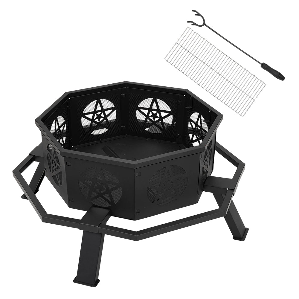 Create memorable moments around the fire pit with family and friends! This versatile fire pit combines heating and grilling functions, easily meeting various outdoor needs such as warming up, campfires, and barbecuing. Its unique octagonal design features a stylish look and includes footrests, allowing multiple people to gather comfortably and enjoy relaxing moments together. Star-shaped venting patterns on the sides enhance airflow for better combustion while adding decorative charm. It comes with a grill grate, making it convenient to cook delicious meals right over the flames—perfect for picnics, camping trips, or backyard gatherings.