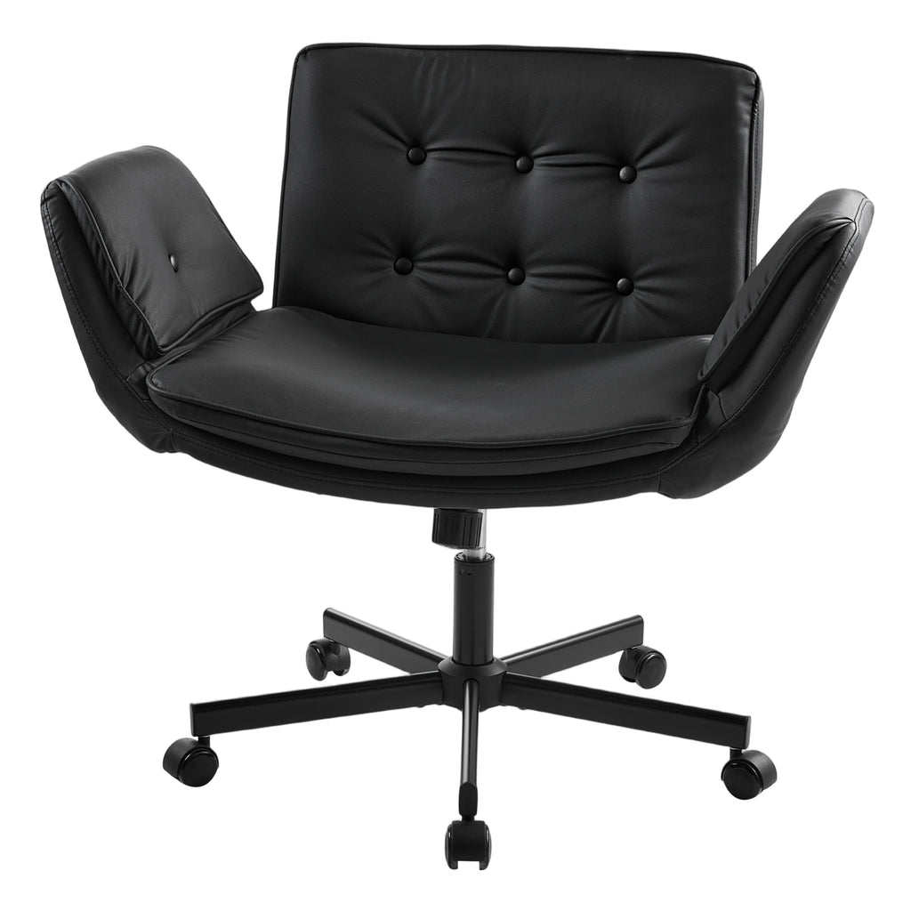 Bring timeless mid-century style to your workspace with this elegantly crafted office chair. Smooth curves shape a generously proportioned silhouette, while button-tufted details on the backrest and arms add a touch of vintage refinement. The wide seat and seamlessly integrated arms create an open, inviting feel, while the PU leather upholstery wears beautifully over time. Plush padding retains its shape through hours of use, offering lasting comfort that resists sagging. A 360° swivel base and smooth-rolling castors let you move freely around your desk. Equally at home in a modern office or a stylish home setting.