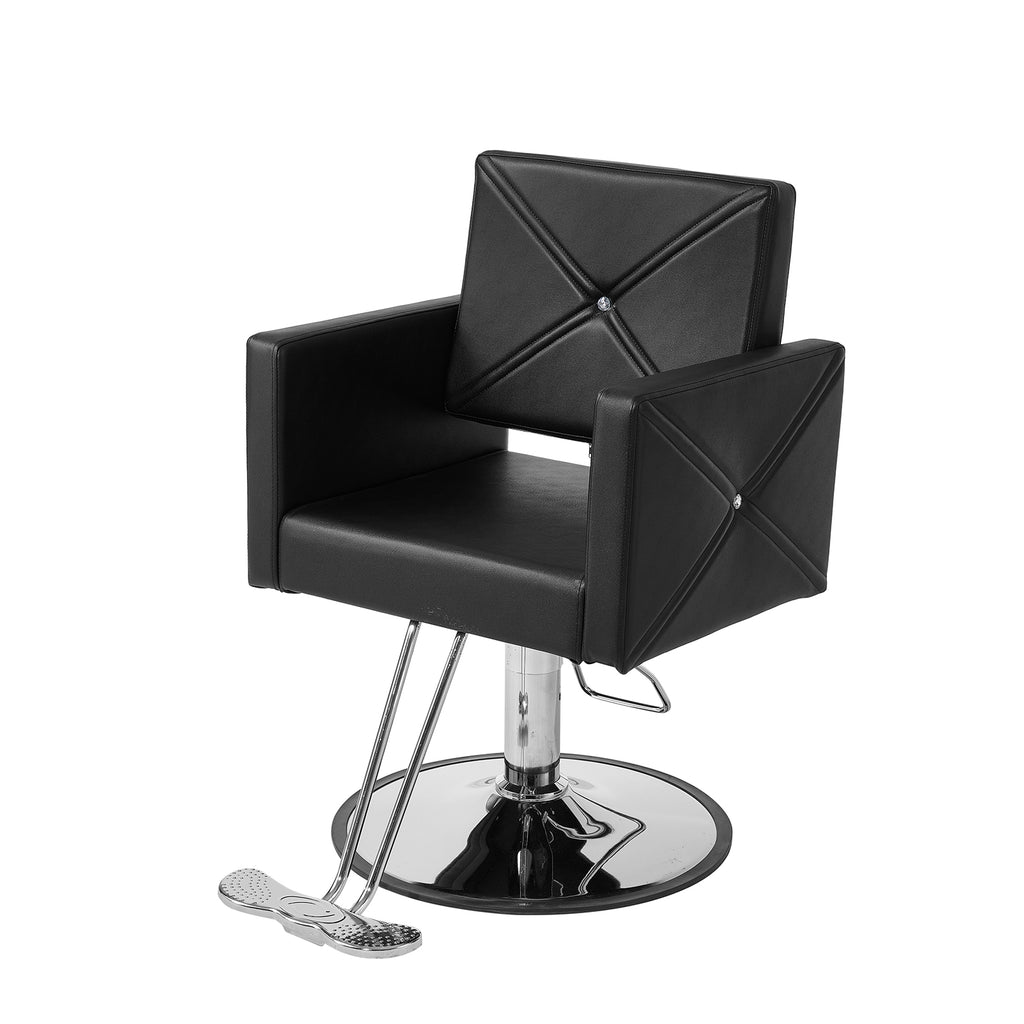 Create a premium experience with this elegant barber chair, perfect for hair salons, beauty parlours, or upscale grooming spaces. The square frame, coupled with X-shaped diamond stitching, adds an exquisite touch of detail. Decorative elements at the centre enhance the overall design, exuding sophistication and style. The armrests offer optimal support, while the backrest ensures a comfortable seating experience. A gleaming electroplated butterfly-shaped footrest provides added support for the feet. Easily adjust the chair height with a foot-operated lever, allowing effortless customisation without bending.