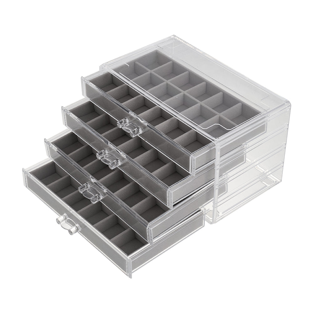 This jewellery box combines durability and elegance in a lightweight plastic outer shell. The transparent shell allows you to see the contents at a glance, while the soft flocking interior helps protect necklaces, earrings, and rings from scratches. The smooth edges ensure safe handling, and a stylish handle allows effortless opening. The drawer-style design glides smoothly, keeping items organised and dust-free. With its clean, minimalist look and practical features, it is an ideal accessory for everyday storage and display.