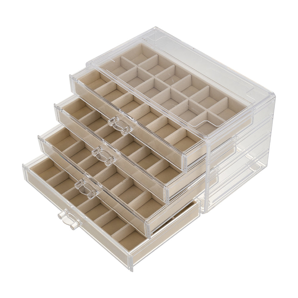 This jewellery box combines durability and elegance in a lightweight plastic outer shell. The transparent shell allows you to see the contents at a glance, while the soft flocking interior helps protect necklaces, earrings, and rings from scratches. The smooth edges ensure safe handling, and a stylish handle allows effortless opening. The drawer-style design glides smoothly, keeping items organised and dust-free. With its clean, minimalist look and practical features, it is an ideal accessory for everyday storage and display.