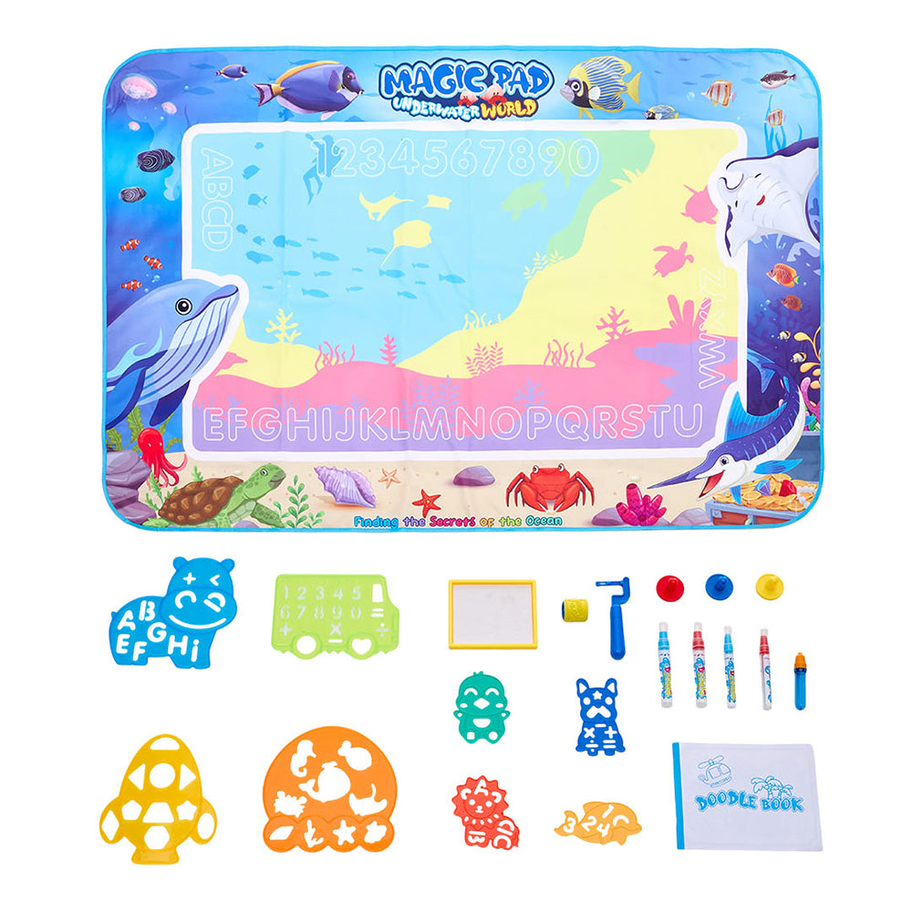 Embark on a fascinating journey of discovery with this ocean-themed water doodle painting mat, which offers children a vibrant underwater world to explore. The large-size design accommodates multiple kids for collaborative creation, while the unique water-reactive colouring function sparks endless imagination. Equipped with a ruler and pattern stencil combo, a roller stamp, pens, and a drawing booklet, it assists kids in sketching a variety of adorable designs. Through tracing and drawing, kids not only learn new things but also enhance their hand-eye coordination and creative thinking. This is not only a toy but also a bridge for parent-child interaction, sharing wonderful drawing moments together.
