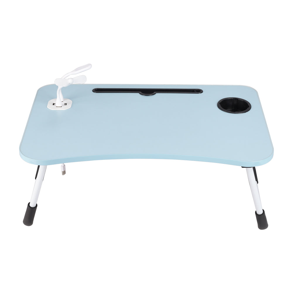 Der Tisch ist aus mitteldichten Faserplatten und Eisen gefertigt, deshalb ist er robust, langlebig und bietet eine hervorragende Tragfähigkeit. Er verfügt über integrierte Getränkehalter, eine Ablage für Tablets und USB-Anschlüsse. Die mitgelieferte LED-Lampe sorgt für weiches Licht, während der USB-Lüfter mit einer sanften Brise für zusätzlichen Komfort sorgt. Dank der rutschfesten Pads an den Tischbeinen steht er stabil auf allen Oberflächen.