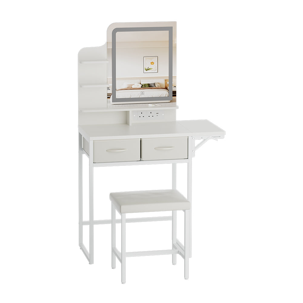This dressing table and stool set combines refined design with everyday functionality to create a calm, organised beauty space. A distortion-free mirror ensures accurate colour and detail for flawless makeup, while three open shelves on the side keep perfumes and small accessories within easy reach. The spacious tabletop includes a fold-out extension for added workspace when needed. Two lower drawers provide discreet storage, and a matching cushioned stool tucks neatly underneath. Ideal for compact or spacious rooms, it delivers elegance, order, and daily convenience.