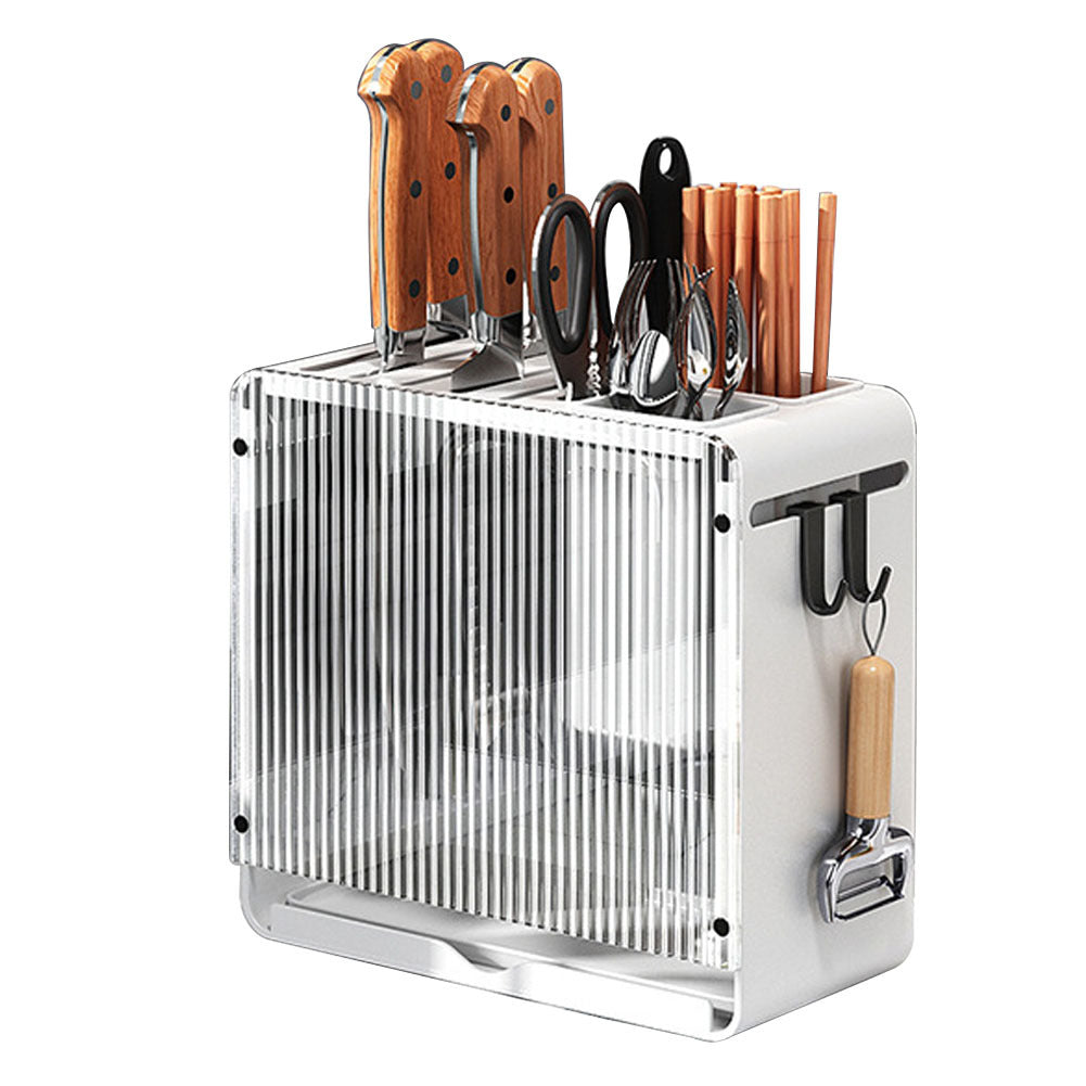 Elevate your knife organization with the Livingandhome Acrylic Knife Utensil Holder. Featuring a visible front panel, the holder provides a clear view of all your cooking tools. Four additional hooks that hang on both sides are included for holding tools that you most frequently use like a pair of scissors. Additionally, a bottom drainage tray collects the excess water to save you the trouble of wiping the countertop over and over again. It is made from a high-temperature lacquered material frame, which makes sure that it can stand up to everyday use.