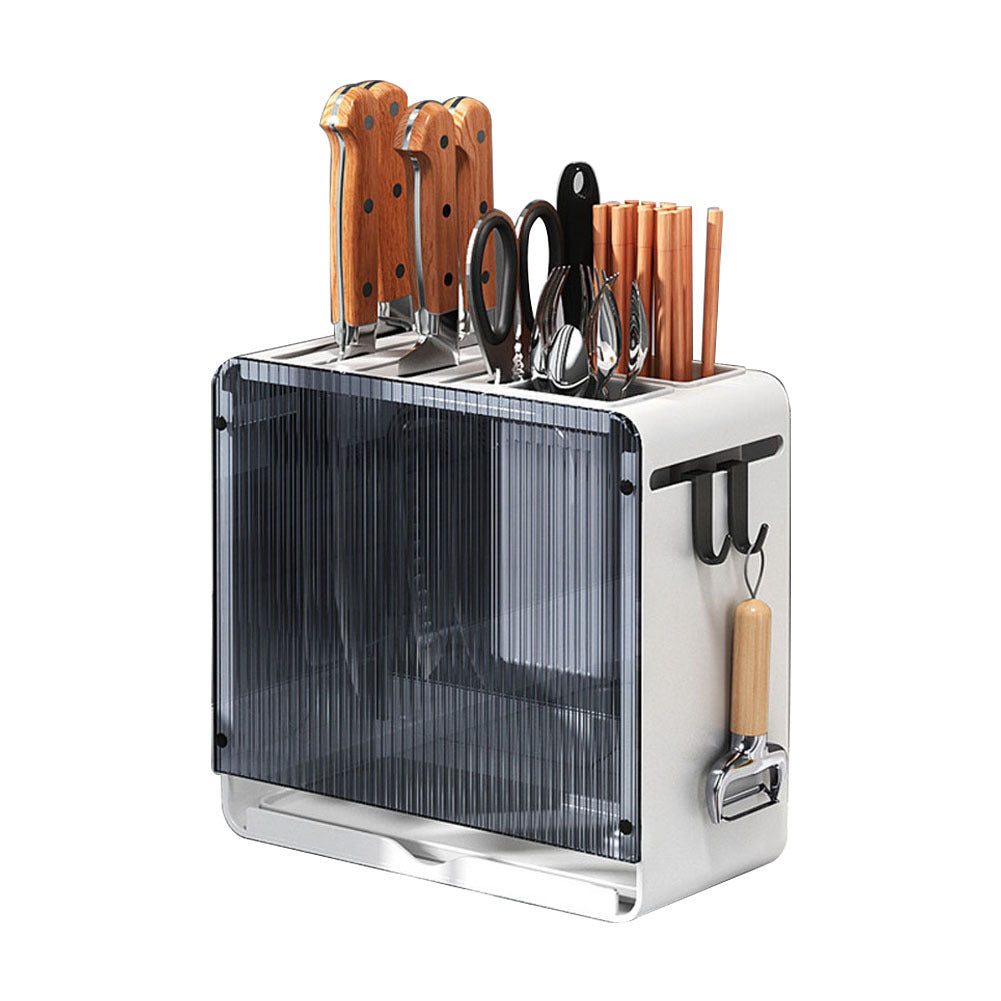 Elevate your knife organization with the Livingandhome Acrylic Knife Utensil Holder. Featuring a visible front panel, the holder provides a clear view of all your cooking tools. Four additional hooks that hang on both sides are included for holding tools that you most frequently use like a pair of scissors. Additionally, a bottom drainage tray collects the excess water to save you the trouble of wiping the countertop over and over again. It is made from a high-temperature lacquered material frame, which makes sure that it can stand up to everyday use.