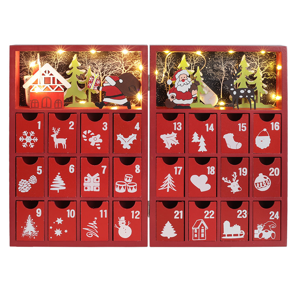This Livingandhome Advent calendar opens up like a book to display 24 drawers and festive winter scenery. Each drawer features a different Christmas-themed pattern. Fill them with little gadgets for countdown surprises. In an inviting red finish, this calendar will complement any holiday decor in an instant. Made from selected MDF, this book is reusable. Just fold it up and bring it out next year.