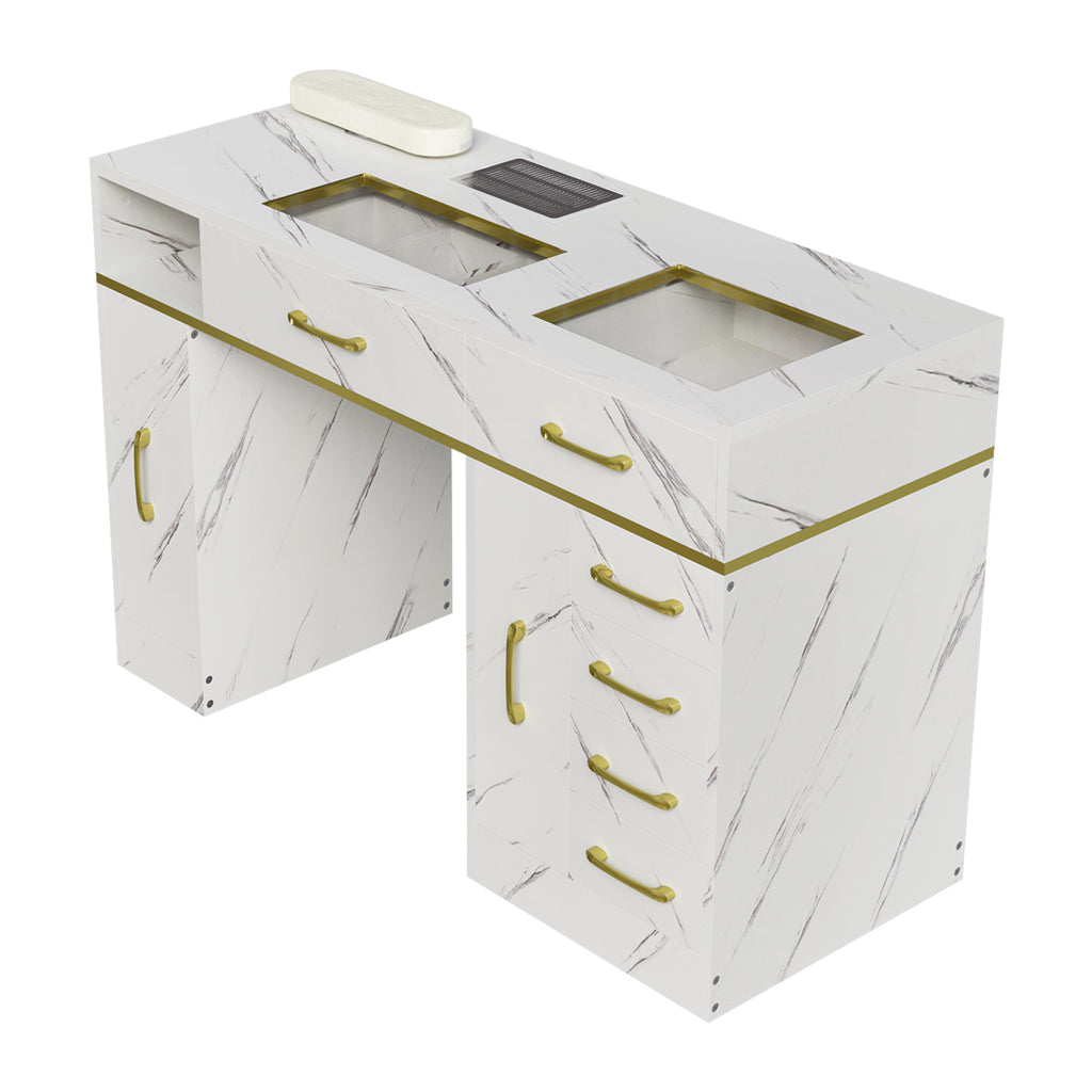 This manicure table is a salon essential, featuring a stylish marble-textured finish and practical design. The spacious surface provides ample workspace for all nail services. A soft wrist cushion enhances client comfort during treatments. A built-in dust collector quickly removes nail clippings and dust, maintaining a clean and hygienic environment. Multiple storage spaces help to keep all your tools and products neatly organized and within easy reach.