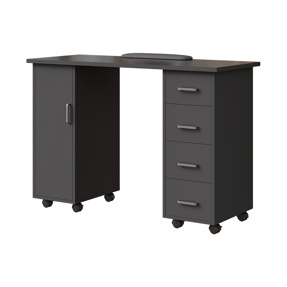 This manicure table is designed for efficiency-focused nail technicians. It features a sleek solid-colour finish that exudes premium style and seamlessly fits into any salon setting. Its spacious tabletop offers ample room for nail lamps, tool trays, and more. Multiple drawers and a cabinet with an adjustable shelf provide organised storage for all your nail supplies, keeping your workspace tidy. Drawers and a cabinet door are fitted with sleek bar handles for easy opening and closing. Plus, integrated casters allow effortless mobility, making it easy to reposition as needed.
