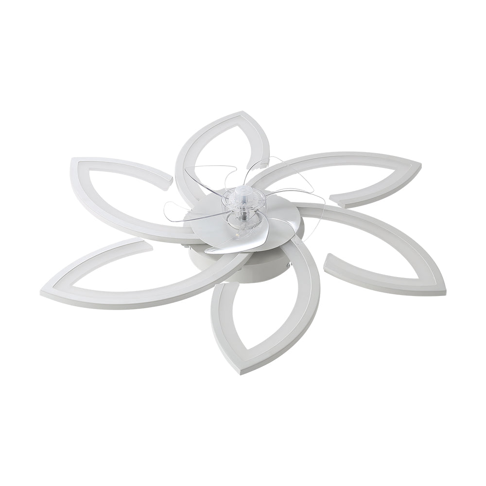 Let light and breeze bloom quietly on your ceiling! This ceiling fan light draws inspiration from blooming flowers, with a metal frame outlining six petal-shaped panels paired with acrylic frosted shades. When lit, it resembles a softly glowing flower, blending artistic flair with ambient warmth. Transparent fan blades remain almost invisible in operation, preserving the elegant aesthetic. A built-in DC motor runs quietly and smoothly, offering 6 speed settings and reversible airflow to boost indoor ventilation. Dual controls let you adjust lighting and fan easily, making it ideal for living rooms, bedrooms and studies.