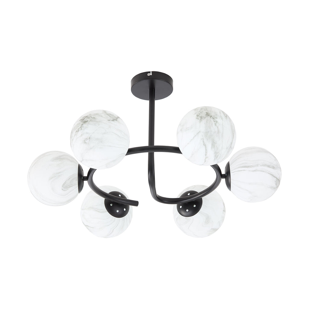 Transform your space with this exquisite ceiling light, a masterpiece blending artistic design with practical illumination. The high-transparency glass shade boasts a stunning faux marble finish, drawing the eye and adding a touch of luxury. Encased in a black iron frame, it showcases understated industrial charm. Its soft and diffused light is kind to your eyes, ideal for extended reading or work, reducing glare and creating a warm, inviting ambiance. Featuring six light heads, it casts a wide and even glow, effectively illuminating medium to large rooms like living areas, dining rooms, or bedrooms.