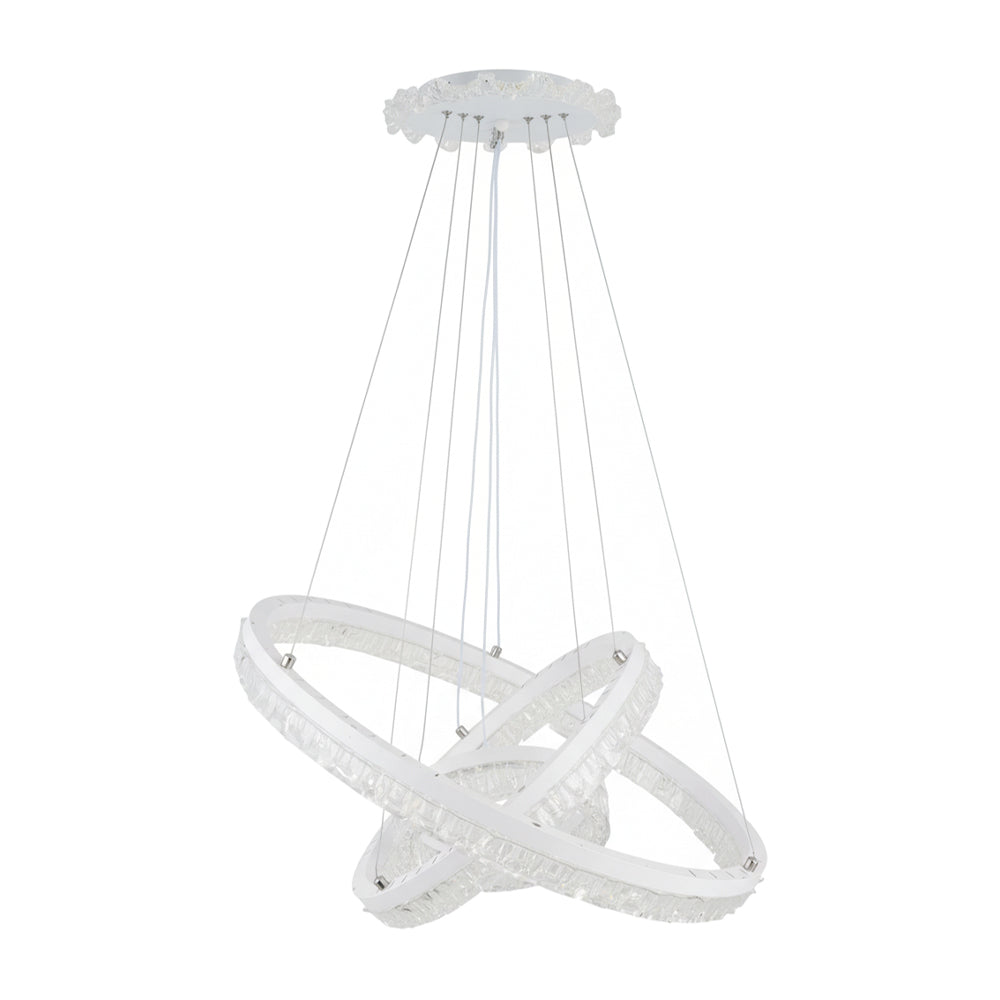 Embrace modern elegance with this pendant light, designed with a minimalist aesthetic at its heart. Its interlocking ring structure, adorned with clear acrylic light strips, creates a dynamic and visually light effect. Its fluid, graceful lines evoke a warm and sophisticated atmosphere, perfect for enhancing the style of your living room, dining area, bedroom, or study. Suspended by multiple slender wires for stable, artistic presentation, it offers a soft, even glow from its built-in LED, providing efficient and comfortable illumination. This fixture is an ideal choice for contemporary homes, seamlessly blending practicality with decorative appeal.