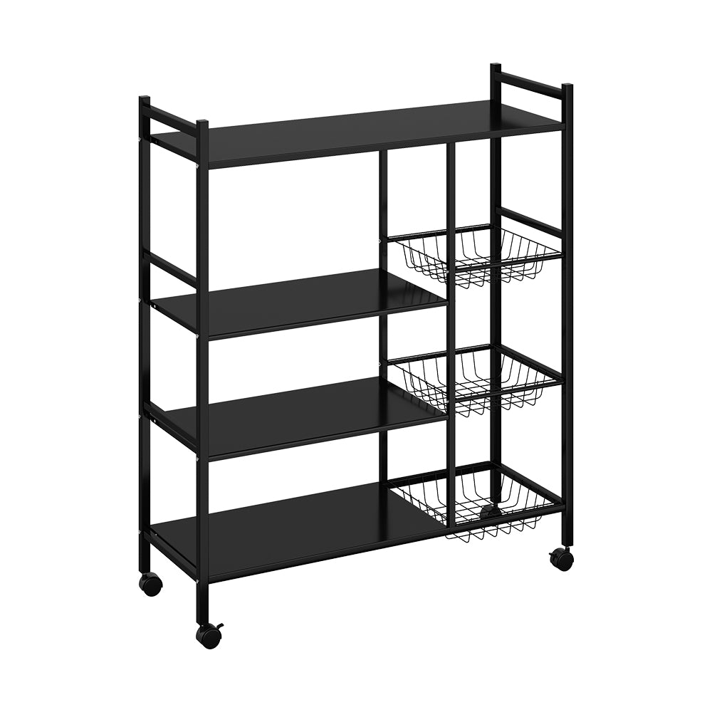 Organise your kitchen with this sleek microwave storage rack. Its all-black metal design exudes modern sophistication, effortlessly complementing various kitchen styles. Multitiered shelves offer ample space for your microwave and other essentials. Handy wire baskets on the side provide extra storage for fruits within easy reach. Fitted with smooth-rolling wheels, the rack allows for effortless mobility, so you can move it around the kitchen as needed. Whether you are decluttering countertops or creating a dedicated cooking station, this rack combines style and functionality to elevate your kitchen space.