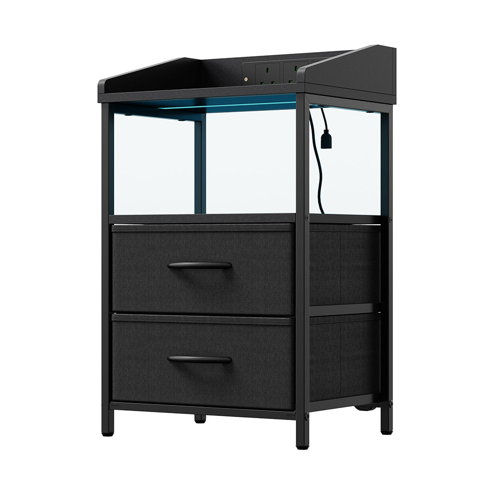 This bedside table combines storage, lighting, and charging in one. Featuring a sleek finish, it easily complements modern home or office setups. The two-tier open shelves allow quick access to daily items, while two fabric drawers provide ample space for other essentials, keeping them dust-free and organised. Each drawer is equipped with a smooth plastic handle for easy opening and closing. An RGB LED light strip offers customisable colours, brightness, and flash modes, etc., to create the perfect ambiance. Moreover, the integrated charging station includes 2 power outlets and 2 USB ports, enabling convenient charging for multiple devices.