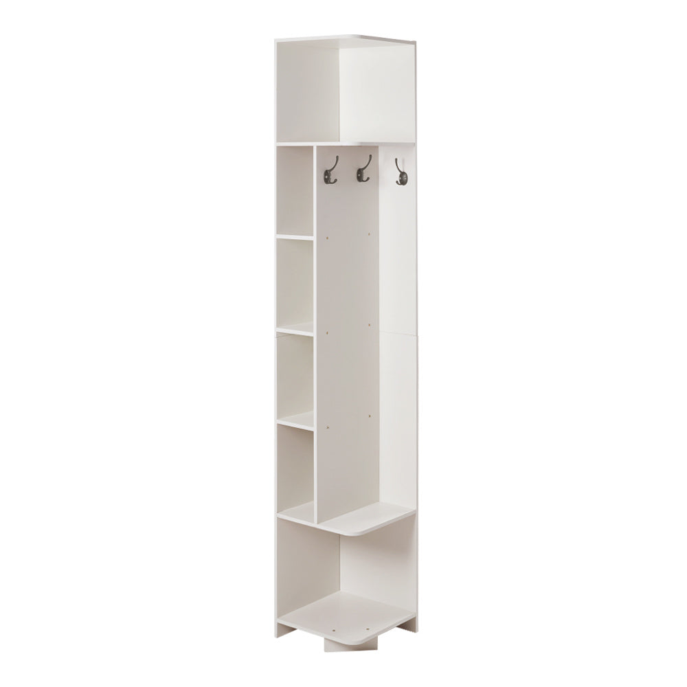 Complement your unused corner space with this stylish corner rack. Crafted from durable thickened MDF, this rack features an open design and various storage options that maximize storage efficiency. What is more, it has three built-in dual hooks that provide convenient hanging space for keys, hats, or towels. The edges of this rack are all rounded, allowing it to deliver a streamlined look and work well with your room corners.
