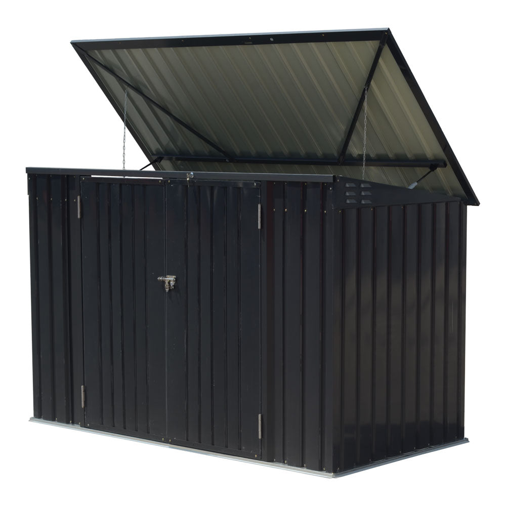 Tired of unsightly bins cluttering your space? Our sturdy shed is just the ticket! Made from thick zinc steel with a water-resistant coating, it is designed to withstand the elements for years. The double outward-opening doors make bin loading and unloading simple, and the hydraulic pneumatic rod design ensures the slow opening and closing of the shed cover. Ideal for gardens, patios, or by the pool, it easily houses two large bins. It is also a versatile storage solution, perfect for storing bikes, garden tools, and more.