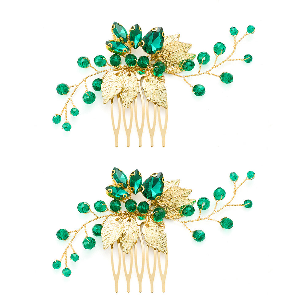 Two pieces, one captivating statement—perfect for elevating any elegant moment. This vintage-inspired hair comb set showcases a classic palette, blending regal sophistication with vibrant charm. Textured metal leaves and lustrous green rhinestones form layered, cascading vines that add rich dimension and movement. Identical in design, they offer versatile styling: wear both for a balanced, crown-like effect or one for subtle luxury. Ideal for bridal updos, braids, or low ponytails, they pair beautifully with gowns, ensuring you shine with confidence.