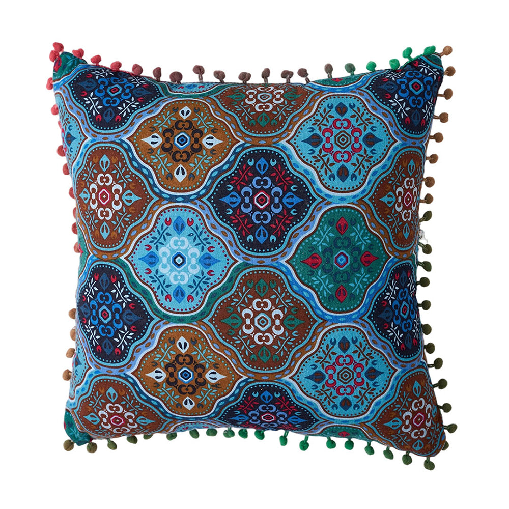Infuse your home with a burst of vibrant, exotic charm with this throw pillow! Featuring intricate patterns inspired by distant cultures, it transforms any space into a work of art. The design blends traditional and contemporary styles, creating an eye-catching focal point. Crafted from a linen-like fabric, its texture is breathable and comfortable, elevating the overall aesthetic of your décor. Colourful pom-pom trim surrounds the edges, adding a playful touch to the cushion. Ideal for adding flair to your sofa, armchair, or bed, it brings style and warmth to any room.