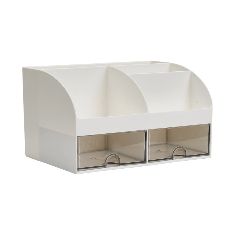Declutter your workspace instantly with this streamlined storage organiser. Its clean white exterior combined with transparent drawers creates a modern, versatile look. A tiered top section with compartments neatly organises pens, tapes and other small essentials for quick access. Two smooth-gliding transparent drawers keep contents visible while preventing dust accumulation. Compact in design, this organiser helps create a tidy and efficient desk setup perfect for offices, study rooms, or dressing table areas.