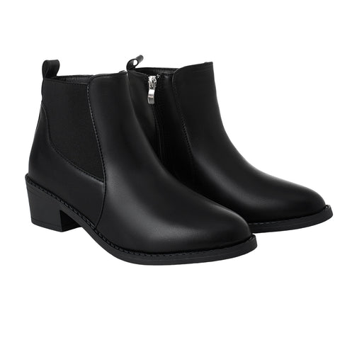 Embrace timeless elegance with these ankle boots, crafted for the modern woman. An ankle-skimming height offers a flattering fit that complements your leg shape without compromising comfort. Elegant pointed toes create a lengthening silhouette for a sharp, contemporary finish. The stitched leather elements create a streamlined silhouette with understated dimension, blending contemporary style with everyday versatility. Supported by a steady block heel, these boots deliver enhanced stability and effortless poise for all-day wear. Rendered in versatile black, they pair seamlessly with everything from dresses and denim to tailored trousers.