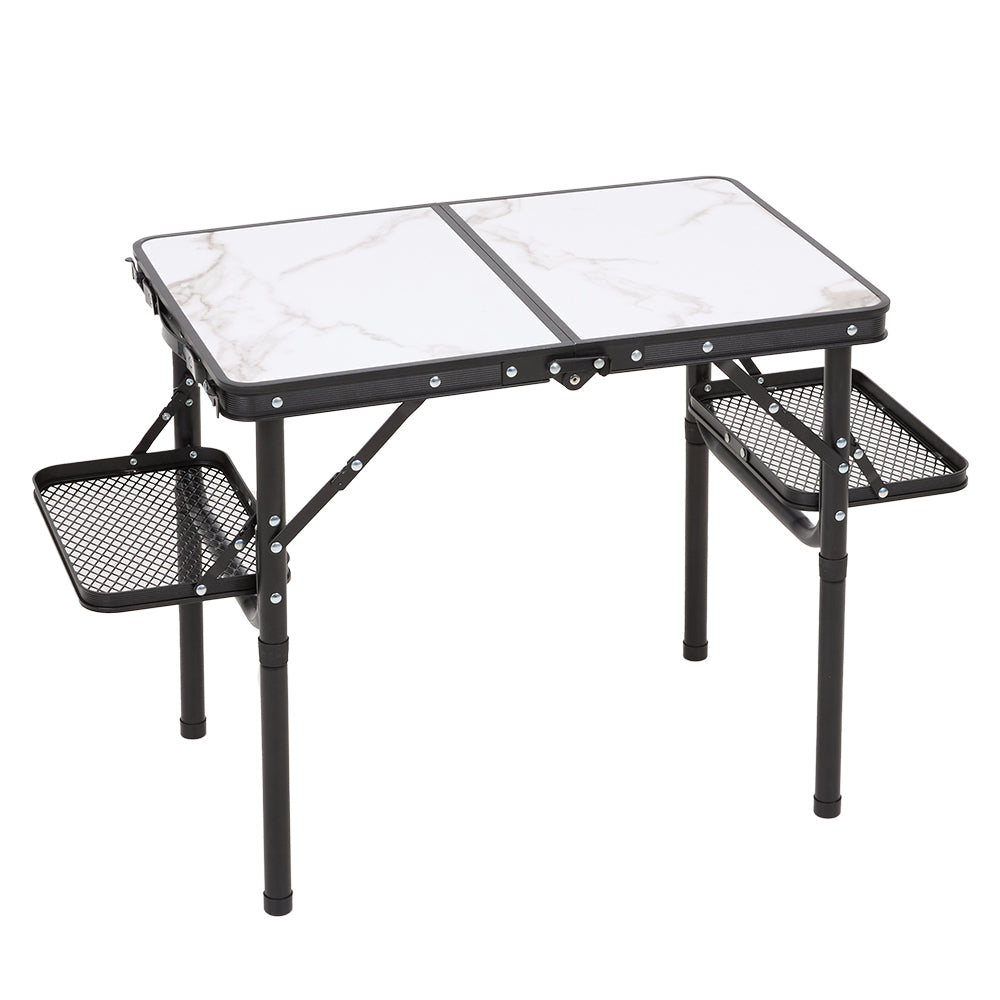 This stylish folding table suits camping, picnics, or temporary home use brilliantly. Its white faux marble top is smooth, scratch-resistant, and wipes clean easily for a quality look. The surface holds up to 30kg securely. Plus, handy folding mesh trays offer extra storage for drinks and utensils. Adjustable legs ensure superb stability, even on uneven ground outside. It provides a spacious, reliable workspace anywhere, from BBQs to quick office tasks. A fashionable, practical choice for all your outdoor needs.