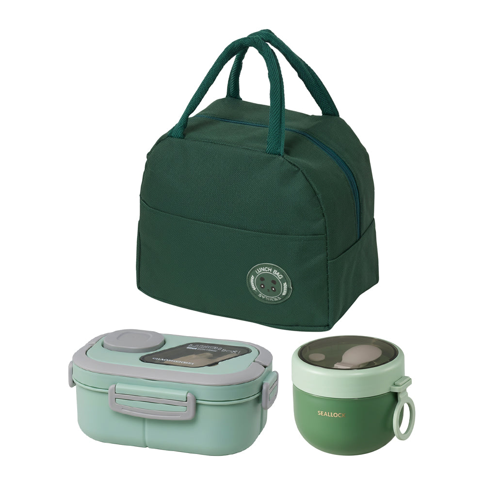 Enjoy homemade meals anywhere with this stylish lunch box set designed for everyday convenience. The set includes a spacious double-layer lunch box with practical compartments to keep mains, sides, and snacks neatly organised. A built-in spork attaches securely to the lid for easy dining on the go. A matching leakproof soup cup with its own lid and spork is ideal for soups or yoghurts. All items fit neatly into the insulated carry bag, which helps maintain food temperature. Perfect for daily commutes, office lunches, or outdoor meals.