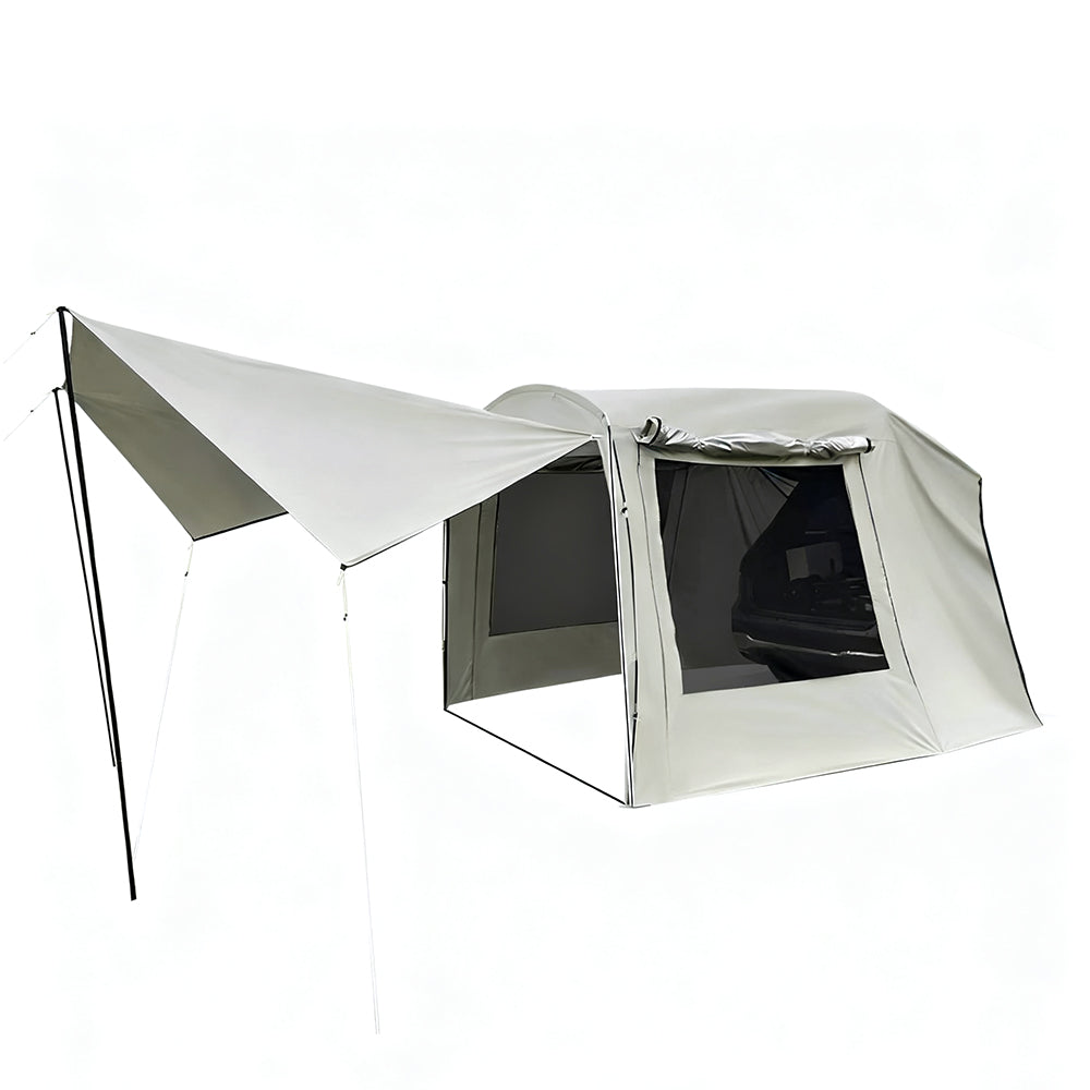 This car tent is crafted for outdoor enthusiasts seeking space and comfort. Made from 210T polyester silver-coated fabric, it offers superior waterproofing and solar reflectivity, keeping interiors cool and protected. Reinforced fibreglass poles ensure stable performance in wind, rain, or uneven terrain. The side mesh windows provide airflow, visibility, and insect protection, while precise stitching guarantees long-lasting durability, making it a reliable companion for any adventure.