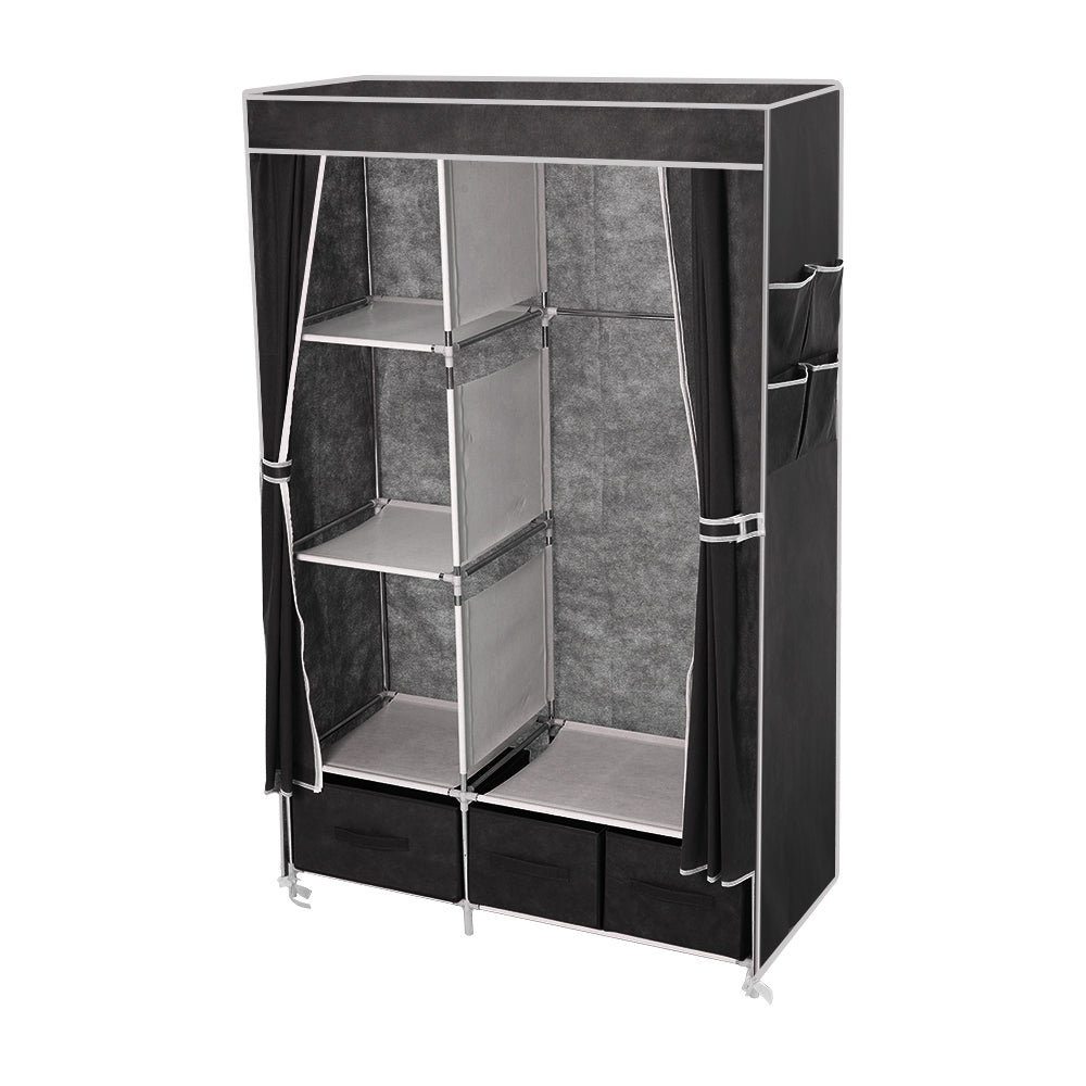 This freestanding wardrobe helps you easily create a neat and organized living space. On the left, three open shelves provide ample room for folded clothes, while the right side features a hanging section that helps keep shirts and long dresses wrinkle-free, complemented by a convenient shelf at the bottom for bags. Three lower drawers are specially designed for underwear, socks, and small accessories, ensuring tidy and easy organization. A non-woven fabric cover protects your garments from dust and moisture. With its compact footprint, this wardrobe fits flexibly into bedrooms, living rooms, or children’s rooms, balancing practicality and space efficiency.