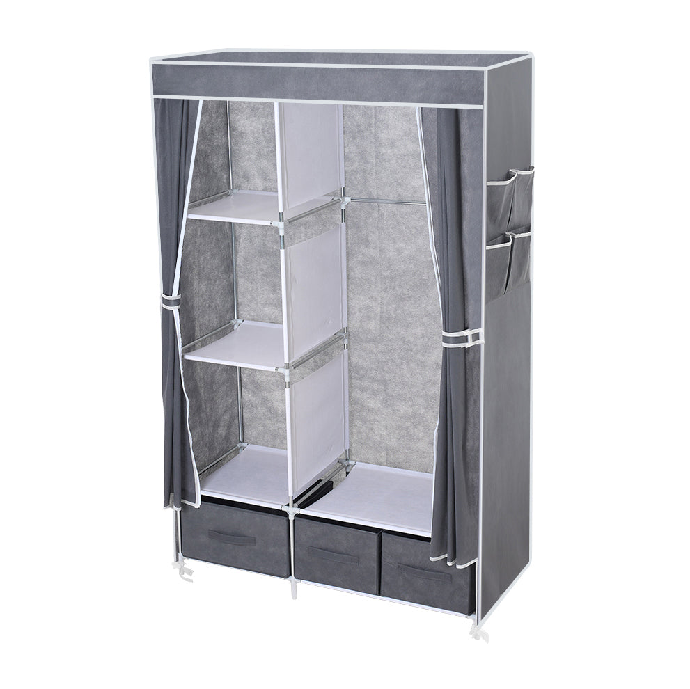 This freestanding wardrobe helps you easily create a neat and organized living space. On the left, three open shelves provide ample room for folded clothes, while the right side features a hanging section that helps keep shirts and long dresses wrinkle-free, complemented by a convenient shelf at the bottom for bags. Three lower drawers are specially designed for underwear, socks, and small accessories, ensuring tidy and easy organization. A non-woven fabric cover protects your garments from dust and moisture. With its compact footprint, this wardrobe fits flexibly into bedrooms, living rooms, or children’s rooms, balancing practicality and space efficiency.