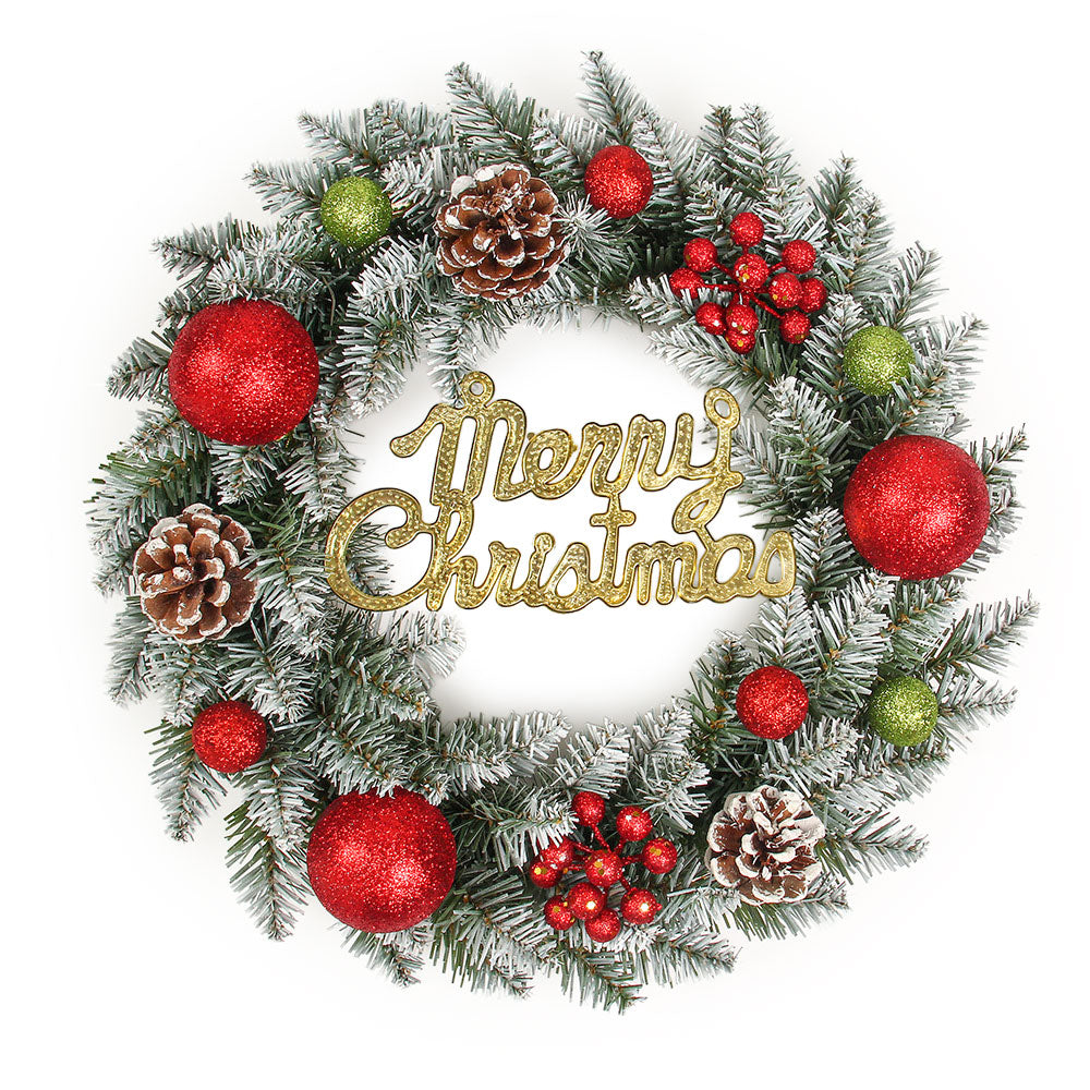 This Christmas wreath combines traditional Christmas elements to bring holiday cheer. Featuring lifelike pine needles delicately dusted with a "snowy" finish, it creates a realistic and natural winter effect. Adorned with natural pinecones and red berries, the wreath gains added texture and a touch of organic charm, enhancing its overall visual appeal. Set against a lush green needle base, vibrant red and green ornaments along with golden "Merry Christmas" lettering bring rich colour and a joyful holiday spirit. Perfect for doors, windows, or walls, it instantly becomes a charming centrepiece of your seasonal decor.