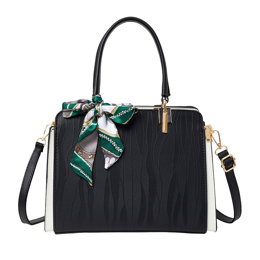 An ideal accessory for any fashion-forward individual. Its textured embossing stands out, adding both depth and visual appeal to the bag. The bold colour blocking creates a striking contrast, making it an eye-catching accessory for any outfit. A playful silk-like scarf tied in a bow adds a touch of charm and sophistication, bringing an element of fun to its design. With a spacious main compartment, securely closed with a zip, this handbag offers ample room for your essentials while keeping them safe. Versatile in use, it comes with a round handle and a detachable shoulder strap, allowing you to switch up your look with ease. Ideal for both casual outings and formal occasions, it is the perfect finishing touch for any ensemble.
