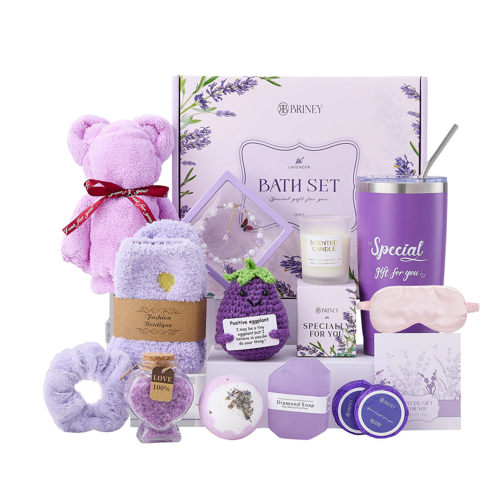 Immerse yourself in a complete at-home spa experience with this elegant bath gift set. Featuring soothing lavender hues and a tranquil aesthetic, each item is designed to bring relaxation and serenity. Lavender bath salts and soap gently cleanse and nourish the skin, leaving behind a refreshing fragrance. A bath bomb releases calming scents and soft colours, enhancing your bathing ritual. A lavender-scented candle creates the perfect atmosphere for unwinding. Complete with a silky eye mask, towel, and socks, this set elevates your self-care routine into a luxurious, sensory journey. It is the ultimate gift for moments of pure bliss.