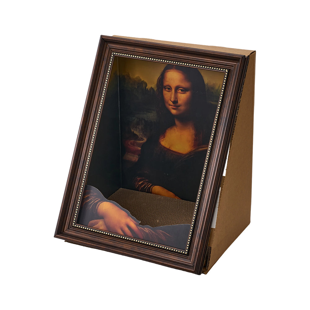 Delight your feline companion with a cat bed that combines creativity, comfort, and style. Inspired by classic art, the design features a vintage deep brown wooden frame, resembling a true oil painting displayed within your home. The triangular support structure ensures sturdy stability, offering a secure space where your cat can rest or play without worry. A semi-enclosed shape provides the perfect balance between privacy and openness, allowing your cat to feel safe while still having easy access in and out. A clever addition of a scratching pad at the bottom satisfies the natural scratching instincts of cats. It is a wonderfully practical and artistic addition to any home and even works beautifully as a decorative prop.