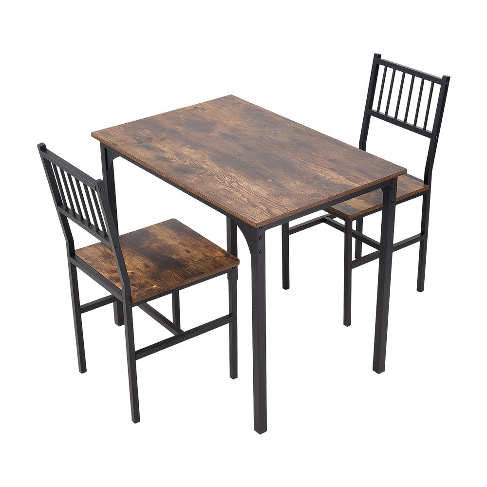 This dining table set seamlessly combines practicality with stylish design, adding a touch of character to any living space. The slatted-back chairs provide comfortable support and are reinforced with a stabilizing crossbar at the base for enhanced durability. Featuring a vintage wood grain tabletop paired with a black metal frame, this set creates a modern industrial aesthetic that is both textured and long-lasting. Its compact size makes it an ideal choice for apartments, kitchen corners, coffee nooks, or small dining areas. Whether for everyday meals, casual gatherings with friends, or use as a workspace or study table, it effortlessly adapts to a variety of lifestyles.