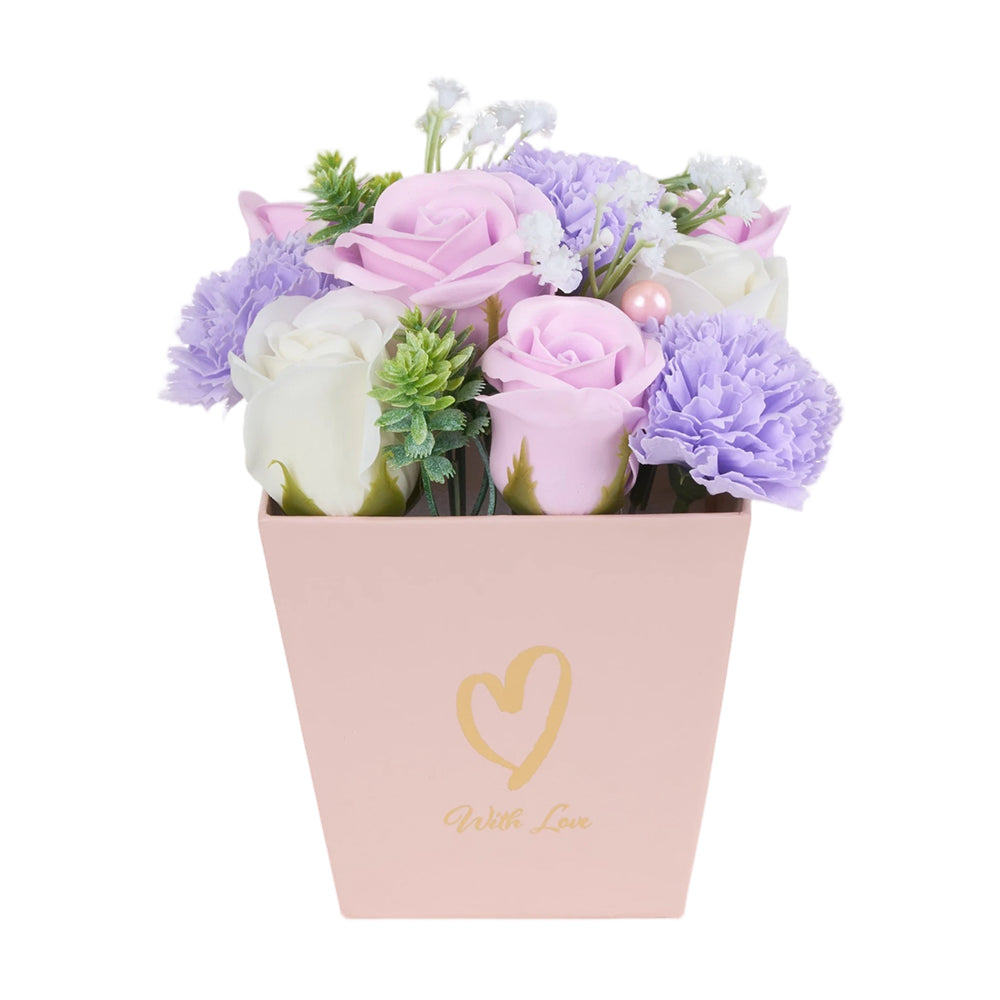 This creative soap flower bouquet gift box elegantly blends artistry with practicality. Crafted from lifelike roses and carnations with delicate greenery, it features rich layers and a realistic, romantic design. Housed in a soft pink matte-finish square paper pot, its gentle hue and refined texture complement any home decor. Beyond its visual charm, it releases a subtle, pleasant fragrance to enhance your space. Beautifully packaged and ready to gift—it is a thoughtful present for wedding anniversary, birthday or any special occasion.