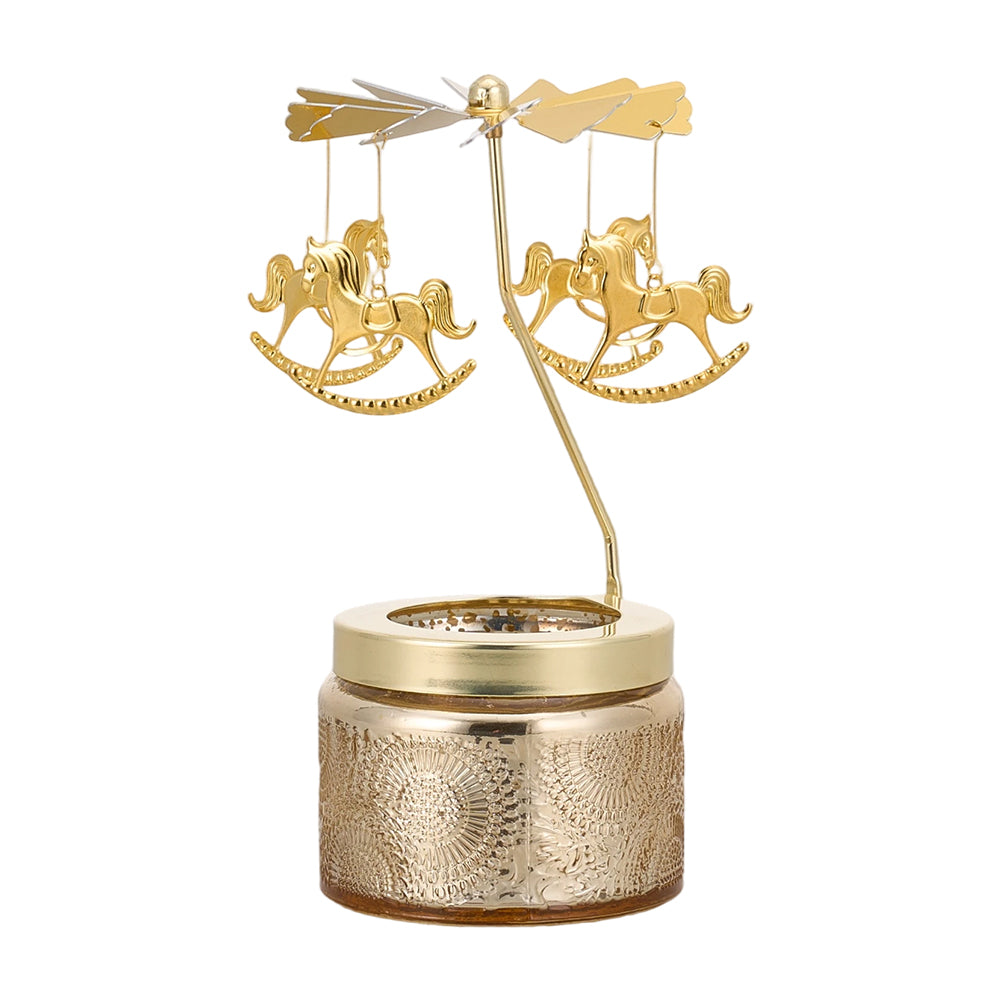This carousel-scented candle combines visual charm with aromatherapy for a multi-sensory experience. A delicate carousel structure is suspended above the candle; when lit, the gentle heat drives the carousel to rotate slowly, instantly creating a romantic and dreamy atmosphere. Its embossed glass container features intricate patterns that capture and refract light, adding an artistic touch to any space. As the candle burns, it releases a rich and long-lasting fragrance, offering a deeply relaxing and tranquil experience. Perfect for bedrooms, living rooms, or cozy reading nooks, it serves as an ideal accent to uplift your mood and soothe your senses.