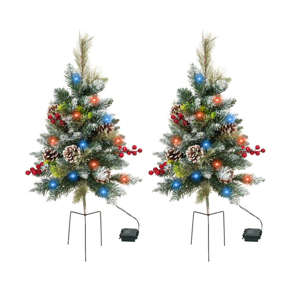 Complete your outdoor festive décor with this 2-pack of Christmas trees, each designed with a sturdy metal tripod stake for easy insertion into soil, planters, or floral foam. Adorned with pinecones and red berries, they showcase lush, realistic pine-like foliage for instant holiday charm. Compact and weather-resistant, these trees are perfect for gardens, porch planters, or entryway displays and ideal for bringing a touch of festive cheer to your outdoor spaces.