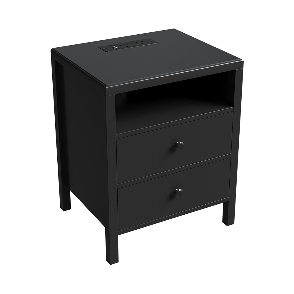 This bedside table set combines contemporary minimalism with practical functionality. Its clean, cubic design complements any bedroom, while the flat top holds a lamp, drinking glass, or smartphone. An open shelf keeps books, clocks, or décor within easy reach, and two drawers provide discreet storage for personal items. A built-in power strip with a discreet rear cable port keeps cords tidy. Raised slightly for visual lightness and easy cleaning, it features a smooth, easy-wipe surface. Designed to be paired, it helps create a balanced, harmonious bedside setting.