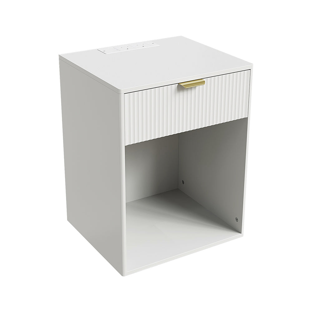 This modern bedside table seamlessly blends minimalist design with practical functionality. Its vertical-striped drawer, paired with elegant golden handle, exude a refined aesthetic. An open recess below the drawer offers flexible storage for books and everyday essentials, while the spacious top provides ample room for alarm clocks, photo frames, and more. Additionally, it features 2 power outlets, along with USB-A and USB-C ports for convenient device charging. Compact and space-saving, this bedside table fits perfectly in bedrooms, guest rooms, and apartment spaces, making it an ideal choice for contemporary living.