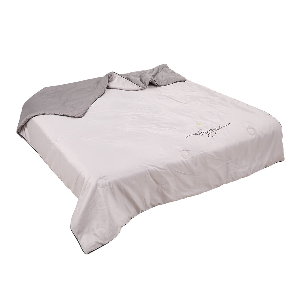 This lightweight cooling quilt, specially designed for air-conditioned rooms, offers breathable comfort for warm summer nights. Exquisite embroidered lettering and elaborate butterfly motifs enhance the aesthetic appeal of the quilt, adding a touch of stylishness to your bedding ensemble. The delicate contrasting piping not only makes the overall design more refined, but also provides effective protection for the edges. Crafted from a cooling ice silk fabric that offers a refreshingly soft feel against the skin, it is the perfect choice for enjoying comfort without overheating on warm nights.