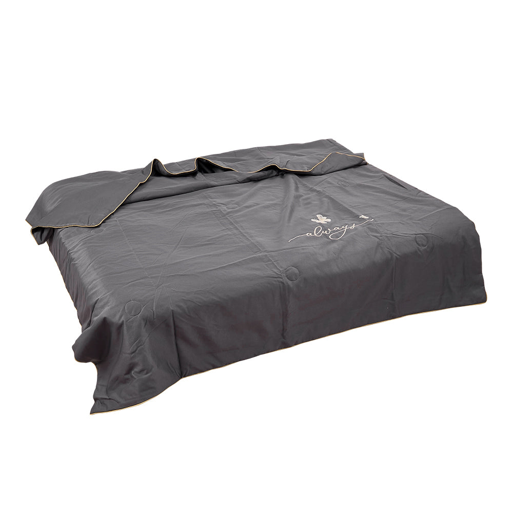 This lightweight cooling quilt, specially designed for air-conditioned rooms, offers breathable comfort for warm summer nights. Exquisite embroidered lettering and elaborate butterfly motifs enhance the aesthetic appeal of the quilt, adding a touch of stylishness to your bedding ensemble. The delicate contrasting piping not only makes the overall design more refined, but also provides effective protection for the edges. Crafted from a cooling ice silk fabric that offers a refreshingly soft feel against the skin, it is the perfect choice for enjoying comfort without overheating on warm nights.